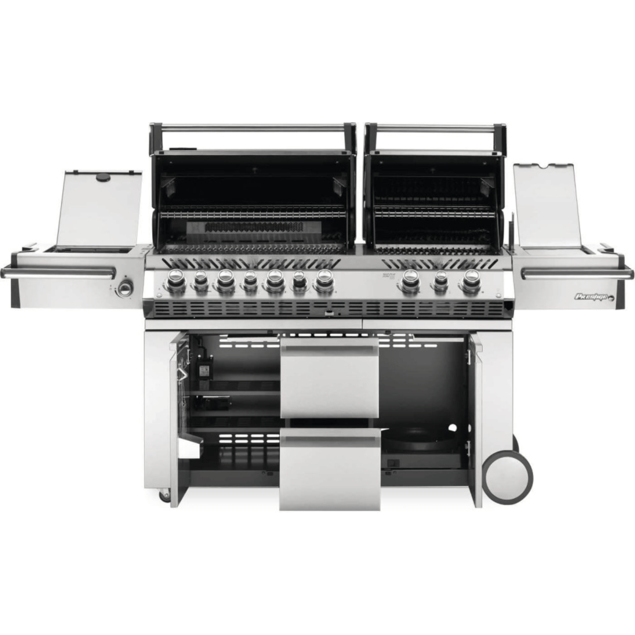 The Napoleon Prestige PRO™ 825 RSBI Premium Freestanding Gas Grill is a luxury outdoor cooking station built for serious grillers. With two independent cooking areas, this stainless steel grill delivers unmatched versatility and performance. The main grill features powerful stainless steel burners and iconic WAVE™ cooking grids, while the secondary section includes two ceramic infrared burners—perfect for searing restaurant-style steaks at high heat.